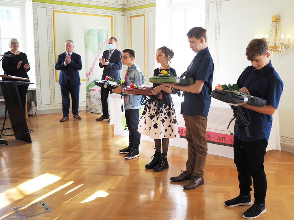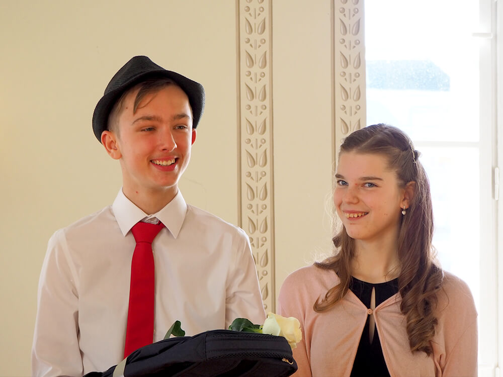 Martina Fischer von dem Verein Jugendweihe Mecklenburg-Vorpommern e. V. hatte für die Gäste und natürlich die Hauptakteure eine Feier in einem sehr geschützten Rahmen organisiert. Die Geigenklänge von Emelie Siewert und die Rezitationen von Heike Klafft sorgten für die besondere Atmosphäre. Thilo Werfel, einer der beiden Geschäftsführer der Wismarer Werkstätten, gratulierte und überreichte zusammen mit Schulleiterin Andrea Wieschmann, mit dem Bürgermeister sowie Martina Fischer die Geschenke, die Urkunden und die Blumen.