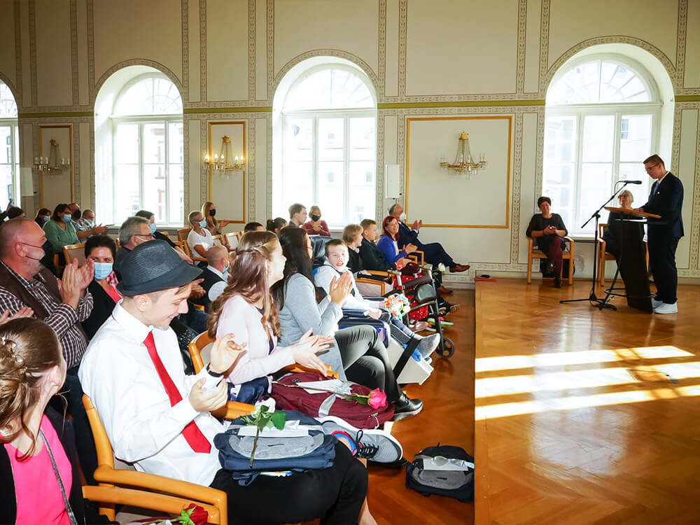 Es ist Tradition, dass der Bürgermeister im Vorfeld der Feierstunde in die Schule geht und mit den Jugendlichen und jungen Erwachsenen spricht – über Hobbys, Wünsche, Zukunftsträume und mehr. "Ich habe mich sehr wohlgefühlt bei euch!", so der Bürgermeister. Ergänzt mit dem, was die Lehrerinnen über ihre Schützlinge zu sagen hatten, entstanden die kleinen Ansprachen an jede und jeden der zwölf Teilnehmer.