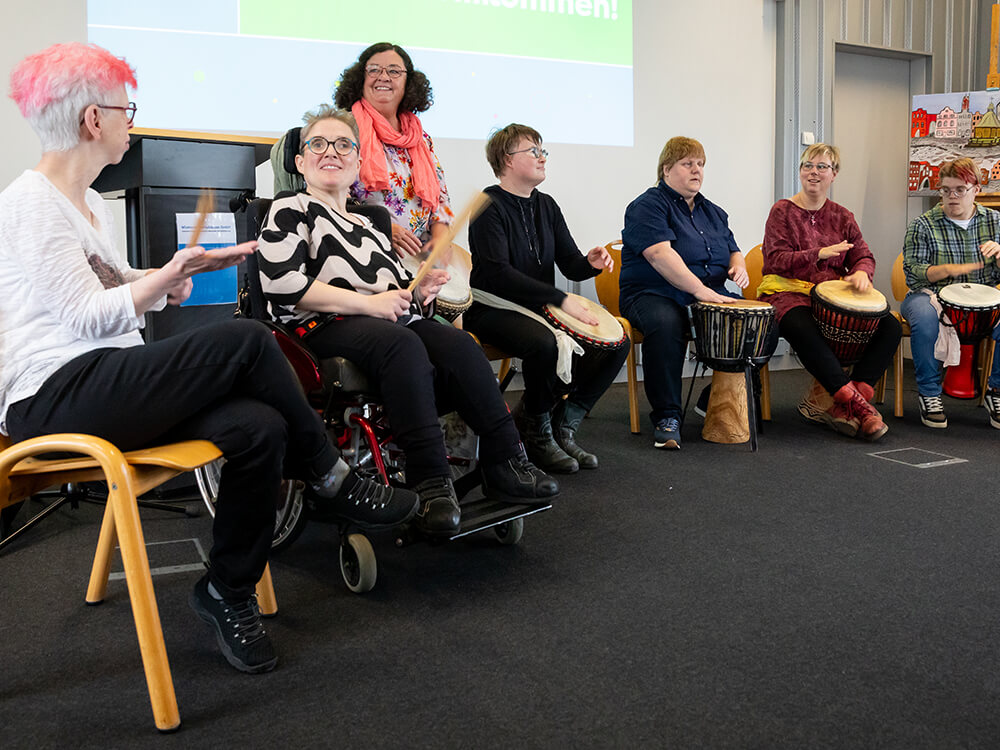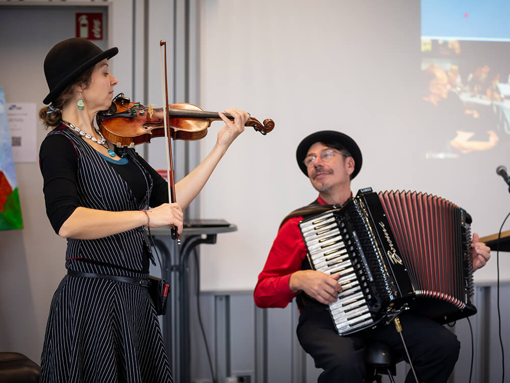 Für stimmungsvolle Abwechslung sorgten die Kinder der Kita Bunte Stifte und der Astrid-Lindgren-Schule, die ein musikalisches Programm vorbereitet hatten. Die Musiker*innen des arbeitsbegleitenden Angebots Klang & Rhythmus aus Wismar spielten einen Blues, gefolgt von den Klassikern "Über sieben Brücken" und "Mit 64(!) Jahren fängt das Leben an". Afrikanische Trommelrhythmen der Gruppe "Tschakata" brachten Schwung ins Publikum. Die musikalische Begleitung übernahm das Duo "Knopf & Zopf" mit Gunnar Rieck und Karoline Frick.