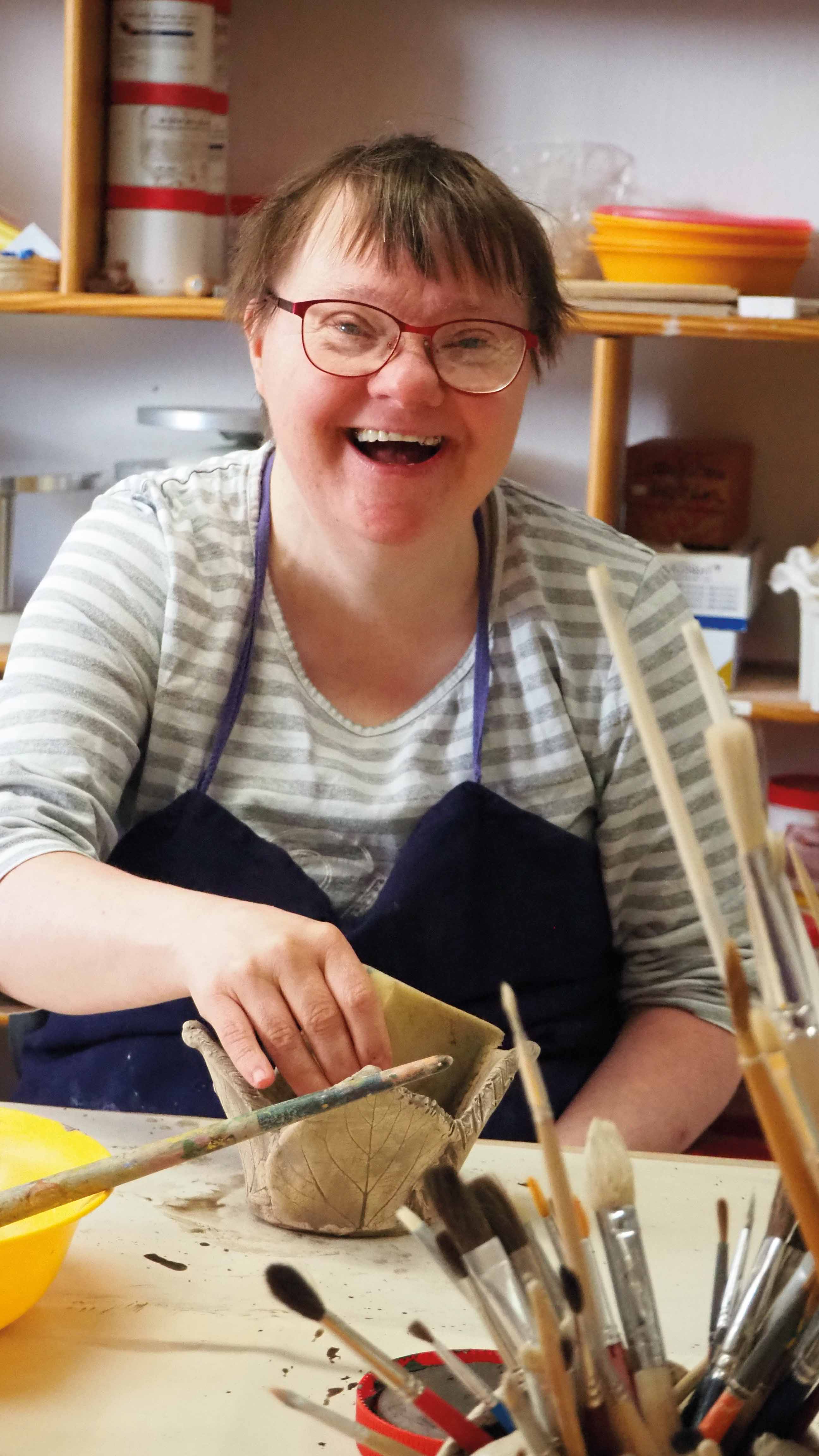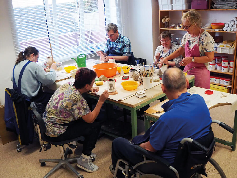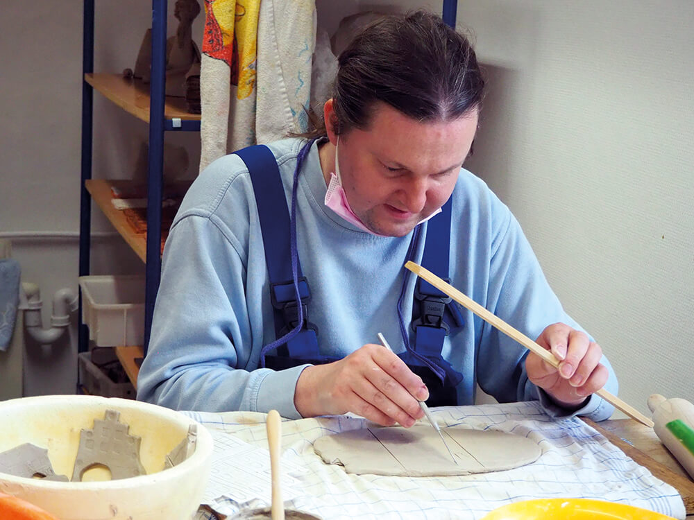 Jede Woche dienstags und mittwochs treffen sich jeweils 5 Mitarbeiter*innen mit ihrer Kursleiterin Angelika Bendiks am Wendorfer Weg 24 zum Töpfern. Sie hatten schon lange darauf gewartet, wieder durchzustarten. In den beiden Gruppen sind erfahrene "Töpfer", die auch vor der Corona-Pandemie schon dabei waren, und Neustarter, die dieses kreative Angebot für sich entdecken. In kurzer Zeit sind viele tolle Kunstwerke entstanden. Alle sind mit viel Freude und Eifer dabei. Aber auch Geduld ist gefragt. Denn bei größeren Projekten muss an mehreren Tagen an dem Kunstwerk gearbeitet werden, ehe es in den Brennofen geht. Danach ist die Freude über das Ergebnis groß, und die Töpferarbeiten werden nun mit der Glasur versehen. Die Spannung steigt weiter. Erst nach dem nächsten Brand, dem Glasurbrand, sind die Einzelstücke richtig fertig und werden dann von allen bestaunt. Zusammen mit den Teilnehmer*innen hat Angelika Bendiks ein Projekt gestartet. In gemeinsamen Gesprächen wurde erarbeitet, Mit so viel Freude dabei! Michael Müller konzentriert sich auf die Gestaltung seiner Arbeit. welche besonderen Sehenswürdigkeiten unsere schöne Hansestadt Wismar zu bieten hat. Und da wussten alle gut Bescheid. Angelika Bendiks stellte Schablonen her, nach denen die Töpfer*innen ein Baudenkmal oder manche sogar mehrere Baudenkmäler als Tonrelief gestalteten. So wurden z. B. die Wasserkunst, die Marien- und Georgenkirche sowie das Wassertor hergestellt. Aus allen Teilen soll dann eine Ansicht von Wismar entstehen. Aber auch an anderen schönen Dingen wird getöpfert. Wichtig ist allen dabei, dass diese einen Sinn haben und sogar im Alltag Verwendung finden, wie z. B. Tassen, Schalen, Seifen- oder Bürstenablagen. Es wird darüber nachgedacht, mit einigen der entstandenen Kunstwerke eine Wanderausstellung zu gestalten. Alle – Töpfer*innen und Kursleiterin – sind begeistert bei der Sache und freuen sich nach ihrem arbeitsbegleitenden Angebot bereits auf das nächste.